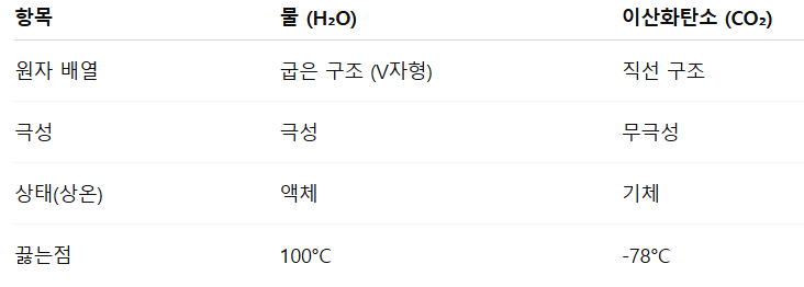 ✅ 물(H₂O)과 이산화탄소(CO₂)의 비교