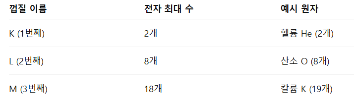 전자는 원자핵 주변을 **껍질(shell)**이라고 부르는 층을 따라 돌고 있어요. 각 껍질에는 들어갈 수 있는 전자의 수가 정해져 있어요.