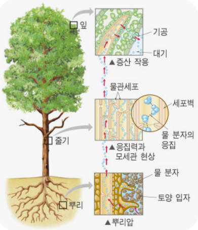 물은 물관을 따라 위로 올라가며 줄기와 잎으로 이동합니다. 이 과정에서 증산 흡인력과 모세관현상, 물의 응집력과 부착력이 중요한 역할을 합니다.