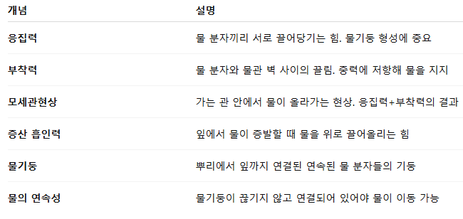 즉, 잎에서 수분이 증발하면 가장 위쪽 물 분자가 빠져나가고, 이와 연결된 나머지 물 분자들이 끌려 올라가는 것입니다. 이것이 물기둥이 형성되고 유지될 수 있는 중요한 이유입니다.