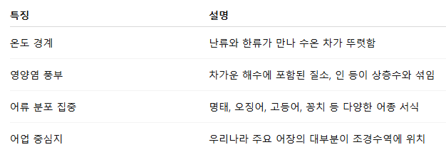 - 난류와 한류의 경계가 형성되어 조경수역이 만들어질 수 있습니다.