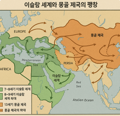– 두 제국의 유산 이슬람 세계는 정신적·문화적 확산, 몽골 제국은 지리적·정치적 영향력을 남긴 제국입니다. 두 제국 모두 우리가 살고 있는 세계의 모습에 깊은 흔적을 남겼습니다. 이런 흐름을 통해 고등학생 여러분은 단순한 사건이나 연도만 외우는 것이 아니라, 역사란 문화, 정치, 인간의 삶이 어떻게 얽혀 있는지를 느끼고 이해하는 것이 중요하다는 사실을 깨달을 수 있습니다.