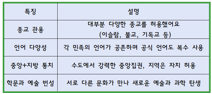 다양한 문화를 수용하여 창의적인 문명 발전 무역과 외교 활성화 민족 간의 교류로 풍부한 유산 남김