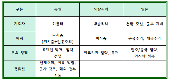 이들 국가는 민주주의와 자유주의에 반대하며, 강력한 군사력과 국민 통제를 통해 외부 정복을 추구했어요.